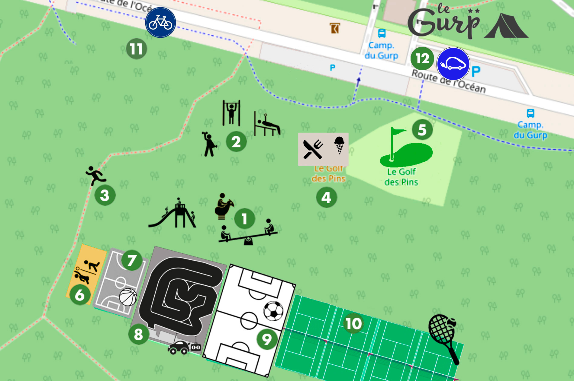 Base d’activités (en face du camping) → détails sur les cartes ci-dessous